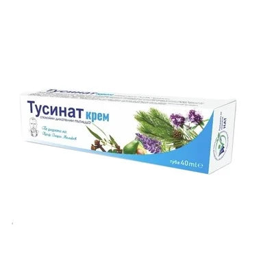 Tusinat крем е медицинско изделие под формата на крем, който съдържа комбинация от етерични масла, които се допълват взаимно за подпомагане и улесняване на дишането. Маслото от Мащерка и Карамфил допринасят за по-свободно дишане. Евкалиптовото масло и маслото от борови иглички притежават втечняващо секрета и отхрачващо действие. По този начин допринасят за по-леко и по-безболезнено изкашляне. Лавандуловото масло придава естествен аромат на крема и спомага за приятното приложение на продукта. Тусинат крем се използва за подпомагане облекчаването на симптомите при простудни заболявания, протичащи с кашлица, бронхити и катари. Улеснява дишането при възпаления на горните дихателни пътища, протичащи със запушване на носа и кашлица. Не съдържа оцветители и синтетични парфюмни композиции. Предлага се в опаковка от 40 мл.