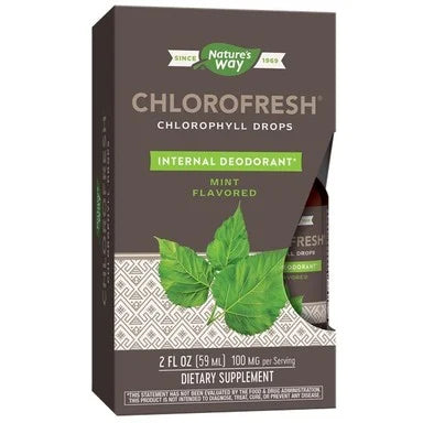 Хлорофилови капки Chlorofresh от марката Нейчърс Уей, които допринасят за достигане на нормалните нива на токсините и другите замърсявания в стомашно–чревния тракт. Дезодорират чревния тракт. При лош дъх и неприятна телесна миризма в критичните зони на подмишниците, интимната област и стъпалата. Не съдържа алкохол. Предлага се в опаковка от 59 мл.