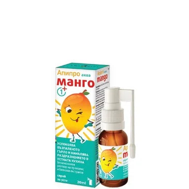 Спреят Apipro Aqua Mango е създаден да защитава детското гърло. Той ефективно облекчава симптомите на възпалено гърло и дразнене в устната кухина. Снабден с противовъзпалително и аналгетично действие. С вкус на манго и апликатор с дълго рамо за по-лесно впръскване на труднодостъпните места в устната кухина и гърлото. Медицинско изделие, подходящо за деца от 1-годишна възраст. Безалкохолен разтвор на прополис. Предлага се в опаковка от 20 мл.