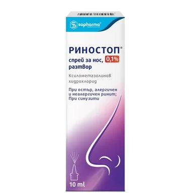 Спреят за нос Rinostop от Софарма съдържа активно вещество от групата на така наречените деконгестанти. При впръскване в носа действа директно върху кръвоносните съдове (артерии и вени) в носната лигавица, като предизвиква свиването им. В резултат на това притокът на кръв към носа и синусите (околоносните кухини) намалява, отокът на лигавицата спада, отделянето на секрети намалява, проходимостта на носните ходове и дишането се подобряват. Риностоп се прилага за повлияване на отока при остър, неалергичен и алергичен ринит (течащ и запушен нос), подпомагане отделянето на секретите при синузити (възпаление на околоносните кухини), в комплексната терапия на възпаление на средното ухо за отбъбване на лигавицата в носоглътката. Ефектът на лекарството настъпва бързо до 2 минути и продължава до 12 часа. За възрастни и деца над 12 годишна възраст. Предлага се в опаковка от 10 мл.