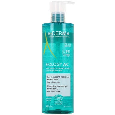 Органичният дерматологичен пенещ се гел А-Дерма Биолоджи АЦ почиства мазната и склонна към акне кожа, без да я изсушава. Създаден с физиологична pH формула без сапун. Предназначен за юноши на възраст над 9 години, младежи и възрастни. Може да се нанася в следните зони - гръб, гръден кош и лице. Ексфолира порите и освобождава кожата от замърсявания. С 99% съставки с естествен произход и органичен овес Rhealba. Има деликатен растителен аромат. Не съдържа съставки с животински произход. Предлага се в опаковка от 400 мл.
