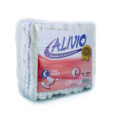 Аливио супер абсорбиращи пелени за възрастни е специално предпазно бельо, подходящо за употреба от пациенти, които имат тежка форма на инконтиненция, както и за пациенти в болнични условия. Пелените са предназначени за употреба през нощта и се предлагат в различни размери в зависимост от килограмите на нуждаещия се. Подходящи за лежащо болни хора. Дишаща материя, която осигурява комфорт и оптимална защита. Размер L, 80-100 кг, супер нощни. Предлагат се в опаковка от 10 броя.