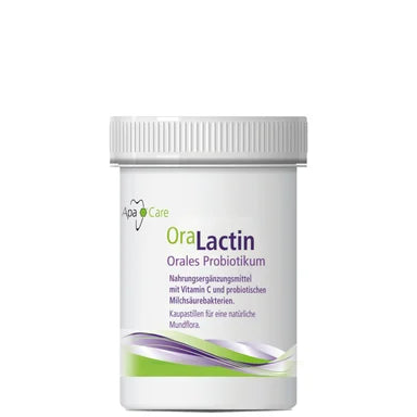 Апа Кеър ОраЛактин орален пробиотик за ежедневна грижа за зъбите и устната кухина. Подходящ за употреба преди и след дентална терапия, както и продължителна употреба у дома. Инхибира патобиотичните бактерии (селективно), възстановява баланса (симбиозата) на здравата орална флора и подпомага оралната имунна и инфекциозна защита. Намалява лошия дъх, предпазва от кариес и пародонтоза, потиска растежа на кариес и пародонтално-патогенни микроби. Поддържа бариерната функция на маргиналния епител. Със свеж вкус и витамин C. Предлага се в опаковка от 30 таблетки.