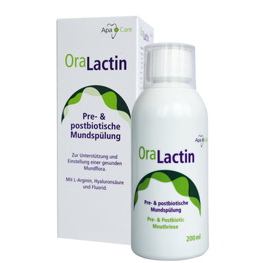 Апа Кеър ОраЛактин пробиотична вода за уста осигурява поддържане и установяване на здрава орална флора. Съдържа флуорид 250 ppmF, пребиотични субстанции, които създават здравословна микросреда, биоактивни постбиотични съставки, стимулиращи регенерацията, L-Arginin за защита от прекалена чувствителност на зъбите и хиалуронова киселина, която регулира влажността в устната кухина, намалява възпаленията и улеснява оздравителния процес в устата. Предлага се в опаковка от 200 мл.