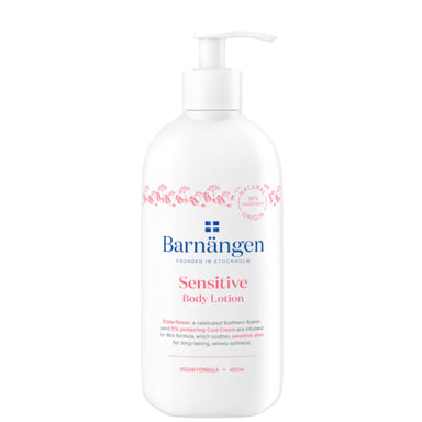 Лосионът за тяло на шведската марка Барненген е предназначен за чувствителна кожа. Веган формулата с бъз и 5% защитен Cold Cream успокоява и подхранва кожата. Лосионът омекотява и хидратира, като оставя след нанасяне приятен аромат. Дерматологично тестван продукт без силикони. 95% съставки от натурален произход. Предлага се в опаковка от 400 мл.