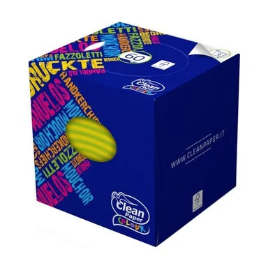 Сухи кърпи Клийн Пейпър от 100% целулоза. Трипластови и цветни. Подходящи за ежедневна хигиена вкъщи или навън. Предназначени за еднократна употреба. Предлагат се в опаковка от 60 броя в кутия.