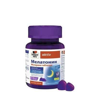 Мелатонинът, под формата на желирани таблетки, от Допелхерц улеснява заспиването и поддържането на пълноценен сън. Съкръщава времето за заспиване и улеснява адаптацията след пътуване със смяна на часовите зони. Съдържа екстракт от лайка, който оказва благоприятно действие при нервно напрежение и трудности със заспиването, и витамин В6, който е важен за нервната система и нормалната психична функция. Продуктът е подходящ за хора, страдащи от умора, недоспиване, подложени на стрес, с динамичен начин на живот и чести пътувания, вегани. С вкус на малина. Предлага се в опаковка от 40 желирани таблетки.