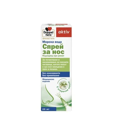 Допелхерц Актив Морска вода спрей за нос е подходящ за приложение при ринит за естествена хидратация и деликатно почистване на носната лигавица. Помощното средство може да се използва и като съпътстващ продукт при лечение на горните дихателни пътища – за ноздрите, носните синуси и чувствителната носна лигавица. Представлява изотоничен разтвор на морска сол с добавени етерични масла от мента и евкалипт. Прилага се за овлажняване на суха носната лигавица, за почистване на носната лигавица при повишена експозиция на полени и домашен прах, като поддържащо лечение при ринит и сенна хрема. Без консерванти. Предлага се в опаковка от 20 мл.