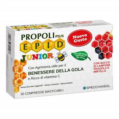 Епид Джуниър Детските дъвчащи таблетки за гърло със сок от малини, ягоди и боровинки са комбинация от патентован E.P.I.D. безвосъчен водоразтворим екстракт от прополис и екстракти от агримония и шипка. Агримонията поддържа доброто състояние на гърлото. Добавената шипка е богата на Витамин С и допринася за защитата на клетките от оксидативния стрес, нормалното функциониране на имунната система и правилния енергиен метаболизъм. С приятен вкус и са подходящи за деца над 7 години. Съдържа подсладител. Без глутен, оцветители и добавена захар. Предлага се в опаковка от 30 броя таблетки за дъвчене.