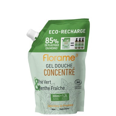 Флорам е душ гел с концентрирана формула, която позволява използването на по-малко количество от продукта, но със същото действие. Една доза е достатъчна за едно измиване. Почиства кожата, образувайки деликатна пяна с аромат на зелен чай и мента. С 98% съставки с естествен произход. Дерматологично тестван продукт. Пълнителят е подходящ за презареждане на опаковките от 100 мл. Предлага се в опаковка от 300 мл.