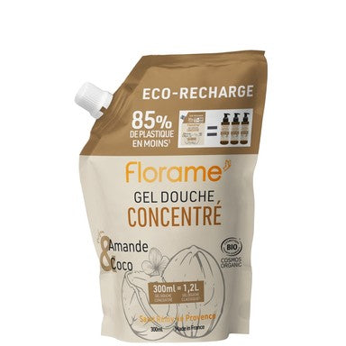 Флорам е душ гел с концентрирана формула, която позволява използването на по-малко количество от продукта, но със същото действие. Една доза е достатъчна за едно измиване. Почиства кожата, образувайки деликатна пяна с аромат на кокос и бадем. С 98% съставки с естествен произход. Дерматологично тестван продукт. Пълнителят е подходящ за презареждане на опаковките от 100 мл. Предлага се в опаковка от 300 мл.