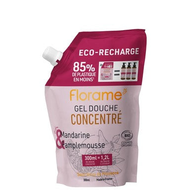 Флорам е душ гел с концентрирана формула, която позволява използването на по-малко количество от продукта, но със същото действие. Една доза е достатъчна за едно измиване. Почиства кожата, образувайки деликатна пяна с аромат на мандарина и грейпфрут. С 98% съставки с естествен произход. Дерматологично тестван продукт. Пълнителят е подходящ за презареждане на опаковките от 100 мл. Предлага се в опаковка от 300 мл.