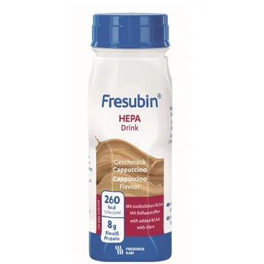 Фрезубин Хепа на немската компания Fresenius Kabi представлява пълноценна ентерална хранителна напитка с вкус на капучино, която се подходяща за прием от хора с повишени протеинови и енергийни нужди, при хронично чернодробно заболяване, изложени на риск от чернодробна енцефалопатия (напр. цироза, хепатит) или при очакване на чернодробна трансплантация (по-специално при деца). Напитката е обогатена с разклонено-верижни аминокиселини, високоенергийна, с фибри, с ниско съдържание на натрий и течности. Без съдържание на лактоза и глутен. Съдържа подсладители и 4 мг/100 мл кофеин. Калоричност 1.3 ккал/мл. Продуктът е опакован в контролирана среда. Предлага се в опаковка от 200 мл.