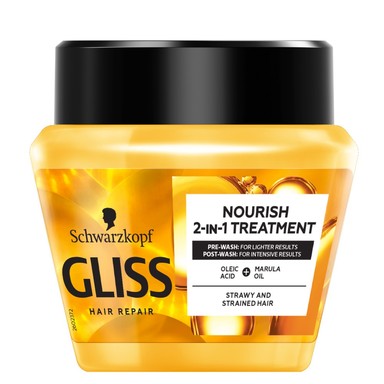 Маската на Глисс е обогатена с подхранващи масла, тя съдържа олеинова киселина и масло от марула за изтощена и суха коса. Осигурява интензивна грижа с подхранващо действие. Предотвратява накъсването и цъфтенето на краищата, регенерира структурата на косъма. След употреба, косата е гладка, мека и лесна за оформяне. Предлага се в опаковка от 300 мл.