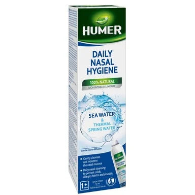 Спреят с термална и морска вода от Хюмер подпомага свободното и спокойно дишане през носа. Отстранява сухотата, отпушва носа и има овлажняващо действие върху носната лигавица. Почиства и предотвратява появата на настинки, ринити и синузити. Възвръща лекотата и комфорта при дишане. Термалната вода в състава е извлечена от Френските Пиренеи, като има благоприятно влияние върху клиничните и микробиологичните характеристики на клетките на носната лигавица, притежава муколитични свойства. Термалната вода се комбинира с морска вода, за да се увеличи наличието на микроелементи и да спомага за балансиране на разтвора с естествени соли. Спреят е богат на микроелементи и е натурален. Подходящ е за бебета над 1 месец, деца, възрастни и бременни. Предлага се в опаковка от 50 мл.