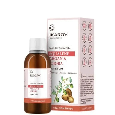 Икаров Сквален, арган и жожоба е бленд от натурални базови и етерични масла, който доставя на кожата ценни биологично активни вещества, подобрява нейната еластичност и ѝ придава жизненост и гладкост. Съдържащият се растителен сквален укрепва хидро-липидния слой, не омазнява и се бори с признаците на стареене. Маслата от арган и жожоба допринасят за задържането на влага в кожата и попиват бързо. Продуктът предпазва от въздействието на свободните радикали, благодарение на вложените натурални антиоксиданти. Подходящ за всеки тип кожа и за всяка възраст. Може да се употребява върху лице и тяло. Предлага се в опаковка от 55 мл.