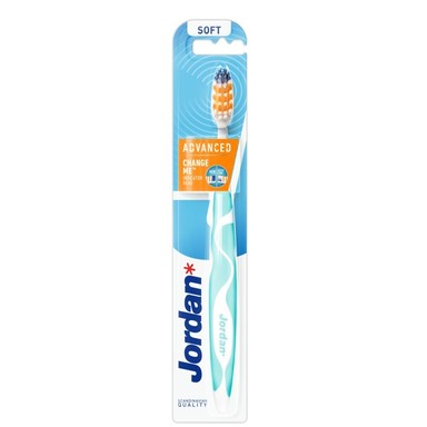 Четката за зъби Джордан Адвансд разполага с меки кръстосани и стъпаловидни влакна и активен връх за цялостно почистване и на най-труднодостъпните зони. Тя отстранява плаката и всички попаднали между зъбите замърсявания. Активният връх (в син цвят) е индикатор ChangeMe, който показва кога да се смени четката. Когато сините влакна станат бели, (обичайно, за период от 3 месеца в зависимост от интензитета на използване), е време четката да се смени с нова. Предлага се в опаковка от 1 брой в различни цветове.