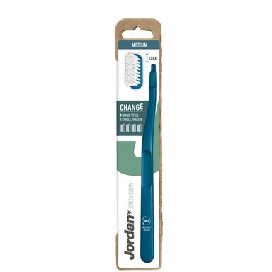 Четката за зъби със сменяема глава Джордан Грийн Клийн Чейндж почиства зъбите, като същевременно защитава околната среда. Дръжката и е изработена от 100% рециклирана пластмаса, а сменяемите глави са направени с найлонови влакна на био основа. Със средно твърди влакна и в 4 различни цвята. Предлага се в 100% рециклирана опаковка, съдържаща 1 дръжка и 4 сменяеми глави.