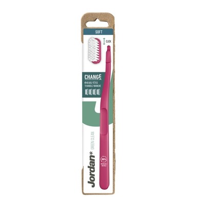 Джордан Грийн Клийн Чейндж е четка за зъби със сменяема глава, която почиства зъбите, като същевременно защитава околната среда. Дръжката и е изработена от 100% рециклирана пластмаса, а сменяемите глави са направени с найлонови влакна на био основа. С меки влакна и в 4 различни цвята. Предлага се в 100% рециклирана опаковка, съдържаща 1 дръжка и 4 сменяеми глави.
