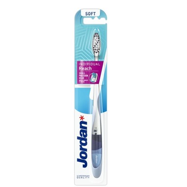 Четката за зъби Джордан Индивидюал Рийч е с меки влакна, които отстраняват замърсяванията от зъбите. Почистват пространството между тях като достигат дори труднодостъпните места. Предлага се в опаковка от 1 брой в различни дизайни и цветове.