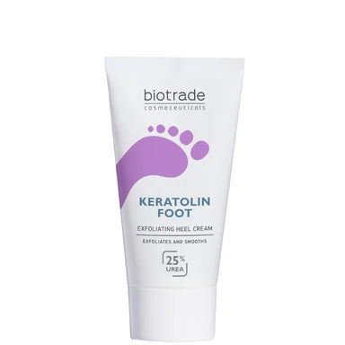 Кератолин Фут Крем за крака 25% уреа от Биотрейд служи за излющване и омекотяване на грубата и нацепена кожа на стъпалата. Чрез ефективната комбинация от хидратиращ комплекс и 25% уреа, кремът за крака нежно ексфолира, като заедно с това успокоява и омекотява новата здрава кожа и запазва естествения водно-липиден баланс. Може да се употребява и за груба кожа на колене и лакти. Хидратиращият крем за крака е хипоалергенен и не съдържа парабени. Предлага се в опаковка от 50 мл.
