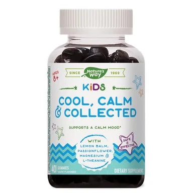 Kids Cool, Calm & collected са вкусни желирани таблетки на Нейчърс Уей, спомагащи за нормалното функциониране на детската нервна система. Натуралният продукт подпомага запазването на самообладание при стрес и напрежение. Добавените Магнезий (цитрат и лактат) и В6 допринасят за доброто настроение. Лимонова трева, пасифлора и Л-теанин съдействат за успокояването и съсредоточаването на децата. Таблетките са на пектинова основа, подсладени с органичен тапиока сироп и тръстикова захар. Не съдържат ядки, млечни продукти, соя, яйца, глутен и са подходящи за вегетарианци. Предлага се в опаковка от 40 желирани таблетки.