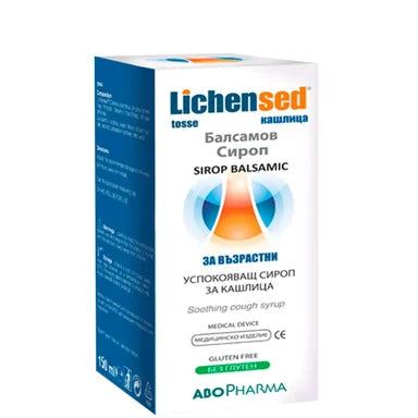 Лихенсед Балсамов сироп на Абофарма е предназначен за суха и влажна кашлица, подходящ за възрастни и деца над 14 години. Той създава защитна бариера, която успокоява и предпазва дихателните пътища. Иновативната му формула е комбинация от натурални съставки, които облекчават кашлицата и дразненето. Исландски лишей - стимулира бронхиалната секреция и подпомага отхрачването, допълнително подсилен с Бяла ружа и Живовлек. Без глутен. Предлага се в опаковка от 150 мл.