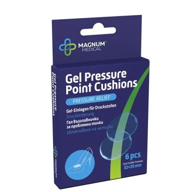 Гел възглавничките за проблемни точки Магнум Медикал осигуряват повече удобство при носене на обувки и предпазват кожата от триене и охлузвания. Те облекчават болката, причинена от притискане, мазоли и мехури. Възглавничките са малки, незабележими и универсални. Прилягат комфортно в обувката и залепват добре, позволявайки Ви да останете активни през целия ден. Размер: 32х25 мм. Предлагат се в опаковка от 6 броя.