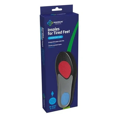 Магнум Медикал Ежедневни стелки при уморени крака за жени са предназначени да облекчат общата болка и да доставят комфорт през целия ден. Здравата им основа осигурява допълнителна терапевтична подкрепа, контрол и стабилност. Абсорбиращият слой от PU пяна омекотява и намалява натоварването. Подсиленият свод поддържа плоските стъпала и падналите сводове и облекчава болката в тях. Възглавничките за предната част на ходилото предпазват метатарзалните кости. Дълбоката чашка на петите спомага за поддържане на правилната позиция на крака, а добавените възглавнички успокояват болката в петите, особено при шипове. Горният слой на стелките Magnum Medical е изработен от полиестерен плат, който намалява триенето, позволява на краката да "дишат" и предпазва от поява на неприятни миризми. Размер: 36-42 номер. Предлагат се в опаковка от 1 чифт стелки.