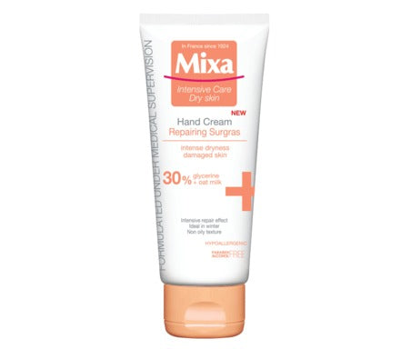 Микса възстановяващ крем за ръце за суха и увредена кожа възстановява и подхранва в дълбочина грубата и напукана кожа на ръцете като успокоява моментално дърпането и усещането за сухота. Възстановяващият крем за ръце на Mixa е изключително подходящ за ползване през студените зимни месеци, когато кожата е изложена на лоши атмосферни условия. Формулата е тествана под медицински контрол. Предлага се в опаковка от 100 мл.