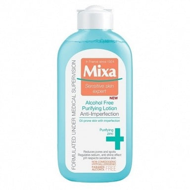 Лосионът за лице на марката Микса е специално създаден за почистване и грижа на мазни кожи с несъвършенства, който нежно отстранява замърсяванията и грима, без да изсушава прекомерно, ефективно регулира омазняването и свива порите, като оставя кожата почистена, освежена, матирана и без несъвършенства. Без алкохол. Хипоалергенен. Тестван върху чувствителна кожа и чувствителна кожа pH. Предлага се в опаковка от 200 мл.