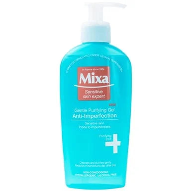 Почистващият гел на Микса е специално създаден за чувствителна и мазна кожа, склонна към появяването на несъвършенства и акне. В състава му влизат цинк и екстракт от мopингa, които с помоща на леки почистващи агенти регулират омазняването и образуването на себум. По този начин кожата остава чиста, свежа и леко матирана. Некомедоногенен и хипоалергенен. Характеризира се с неутрално pH. Не съдържа парабени и сапун. Предлага се в опаковка от 200 мл.