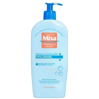 Хидратиращото мляко на Микса е разработено за специфичните нужди на сухата и чувствителна кожа, която по трудно задържа водата. Подходящо за ежедневна употреба, с успокояващ ефект след депилация. Mixa Hyalurogel мляко е обогатено с хиалуронова киселина от естествен произход, която спомага за интензивна 48-часова хидратация. Кожата става видимо по-здрава, сияйна, мека и еластична. С лека текстура, която бързо се абсорбира от кожата. Хипоалергенен продукт, създаден под медицински контрол. Тестван върху чувствителна кожа. Предлага се в опаковка от 400 мл.