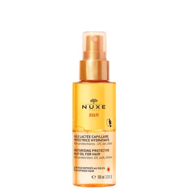 Мултифункционална защита от UV лъчи, сол и хлор, млечното олио за коса на Нукс съчетава два UV филтри за защита на скалпа и косата, запазвайки нейния цвят и красота. Добавените пантенол, био масло от кокос и екстракт от aгаве възстановяват и хидратират, а маслото от жожоба придава мекота и блясък. Притежава двуфазна текстура с копринен финиш и аромат на лято. Съдържа 87% съставки с натурален произход. Предлага се в опаковка от 100 мл.