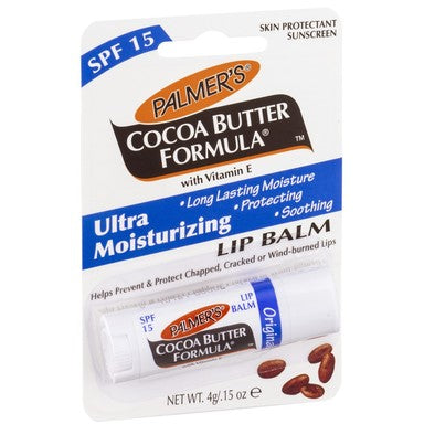 Палмърс балсам за устни с какаово масло, витамин Е и масло от сладки бадеми осигурява интензивна грижа за устните. Той ги предпазва, подхранва и омекотява. Дълбоко хидратира, със слънцезащитен фактор SPF15 и подходящ за превенция от слънце и вятър. Дерматологично тестван. Предлага се в опаковка от 4 г.