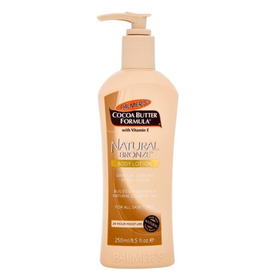 Натураленият бронз лосион за тяло от Палмърс е създаден на базата на чисто какаово масло, обогатено с витамин Е. Продуктът спомага за придобиване на естествен бронзов тен и хидратира кожата в продължение на 24 часа, оставяйки я мека и гладка. Подходящ за всички типове и тонове на кожата. Не съдържа парабени и оцветители. Предлага в се опаковка от 250 мл.