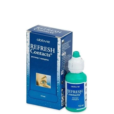 Рефреш Контактс е предназначен за смазване и повторно овлажняване на всички видове контактни лещи. Създаден за облекчаване на сухота, дискомфорт и дразнене, свързани с носенето на контактни лещи. Действието му намалява дискомфорта, причинен от лещите, сухотата и дразнене на очите, свързани с носенето на контактни лещи. Съвместим за употреба с всички видове материали за контактни лещи (меки или твърди газопропускливи) и като цяло може да се използва преди, по време и след носене на контактни лещи и може да се използва многократно според необходимостта, без да е необходим минимален интервал от време между две прилагания. Предлага се в опаковка от 15 мл.