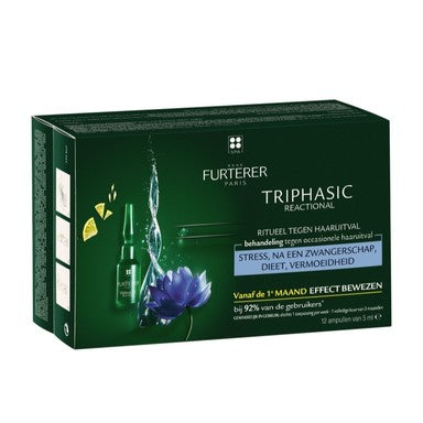 Рене Фюртерер Трифазик Серум против реакционен косопад с формула 2в1 за грижа за плътност и сила на косата. Неговото действие укрепва косата, ускорява растежа и забавя косопада. Формулата е със съставки с 97% естествен произход, които спомагат за удвояване на производството на кератин, подобряват структурата и плътността на косъма. Серумът укрепва отслабналите зони и скалпа, спомага за възобновяването на гъстотата и плътността на косъма и стимулира растежа. С лека текстура, свеж и деликатен аромат, не омазнява и не лепне. Дерматологично тестван, подходящ за чувствителен скалп. Може да се използва и по време на кърмене. След използване на косата е защитена, подсилена и укрепена, с кадифена мекота и подобрен външен вид. Предлага се в опаковка от 12 ампули, всяка по 5 мл.
