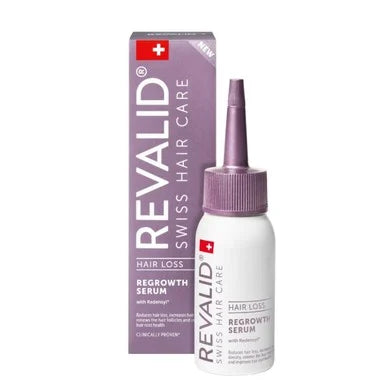 Ревалид Регроу е възстановяващ и ревитализиращ серум за коса с мощна формула срещу косопад, която спомага за спиране загубата на коса и възстановяване на растежа ѝ. Серумът регенерира и ускорява растежа на косата, намалява косопада и увеличава плътността на косъма, действайки директно върху стволовите клетки на космения фоликул. Съдържа Redensyl, две патентовани молекули, получени от лиственица и листа от зелен чай. Комплексното действие на подбраните растителни екстракти и етерични масла с антиоксидантно действие допълват възстановяващия ефект на активното вещество Redensy за оптимален резултат. Включените аминокиселини и пантенол овлажняват сухата коса и скалпа и стимулират подновяването на клетките на кожата. Предлага се в опаковка от 50 мл.