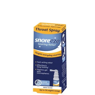 Спреят за гърло Снорийз атакува основната причина за хъркане и е ефективен дори при най-шумните хъркачи. Той съдържа олио от мента, Витамин Е, натриев хиалуронат и ксантанова гума, който тонизира и "смазва" меките тъкани, намалявайки вибрацията им и атакувайки директно основната причина за хъркането. Създаден с иновативна двойнодействаща формула, която тонизира и смазва меките тъкани в задната част на гърлото, за да осигури ефективно облекчение от хъркането в продължение на 8 часа. Предлага се в опаковка от 23,5 мл.
