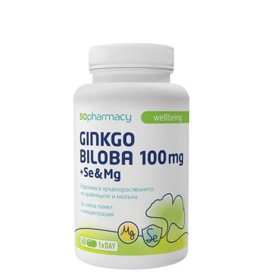 Гинко Билоба 100 мг, обогатена със селен и магнезий от Софармаси. Подпомага кръвооросяването на крайниците и мозъка, има благоприятен ефект при стресови състояния и интензивна умствена активност. В комбинация със селен и магнезий действа като мощен антиоксидант. Продуктът подпомага имунната система и намалява чувството на отпадналост и умора. Предлага се в опаковка от 60 капсули.