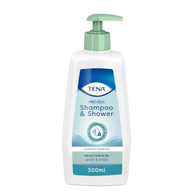Тена шампоан и душ гел за застаряваща кожа с изплакване нежно почиствa и е подходящ за цялостно измиване на тялото и косата, във ваната или под душа. Този лек продукт с двойна употреба, почистващ гел и балсам с шампоан, е създаден специално за хора в напреднала възраст с крехка кожа и коса. С антистатични свойства и със съдържание на Провитамин B5, което улеснява разресването на косата. Премахва неприятните миризми и придава на кожата чувство за свежест и чистота. Дерматологично тестван продукт. Предлага се в опаковка с помпа от 500 мл.