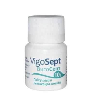 ВигоСепт пудра от Панация представлява антисептичен прах, който действа противовъзпалително, антимикробно и регенериращо. Създаден е на основата на антисептиците, широко използвани за дезинфекция на уста, кожа, ръце и лигавици. Може да се прилага върху протрити, охлузени и зачервени кожни участъци; малки ранички; младежки пъпки и за успокояване на кожата на лицето вечер преди лягане. Предлага се в опаковка от 10 г.